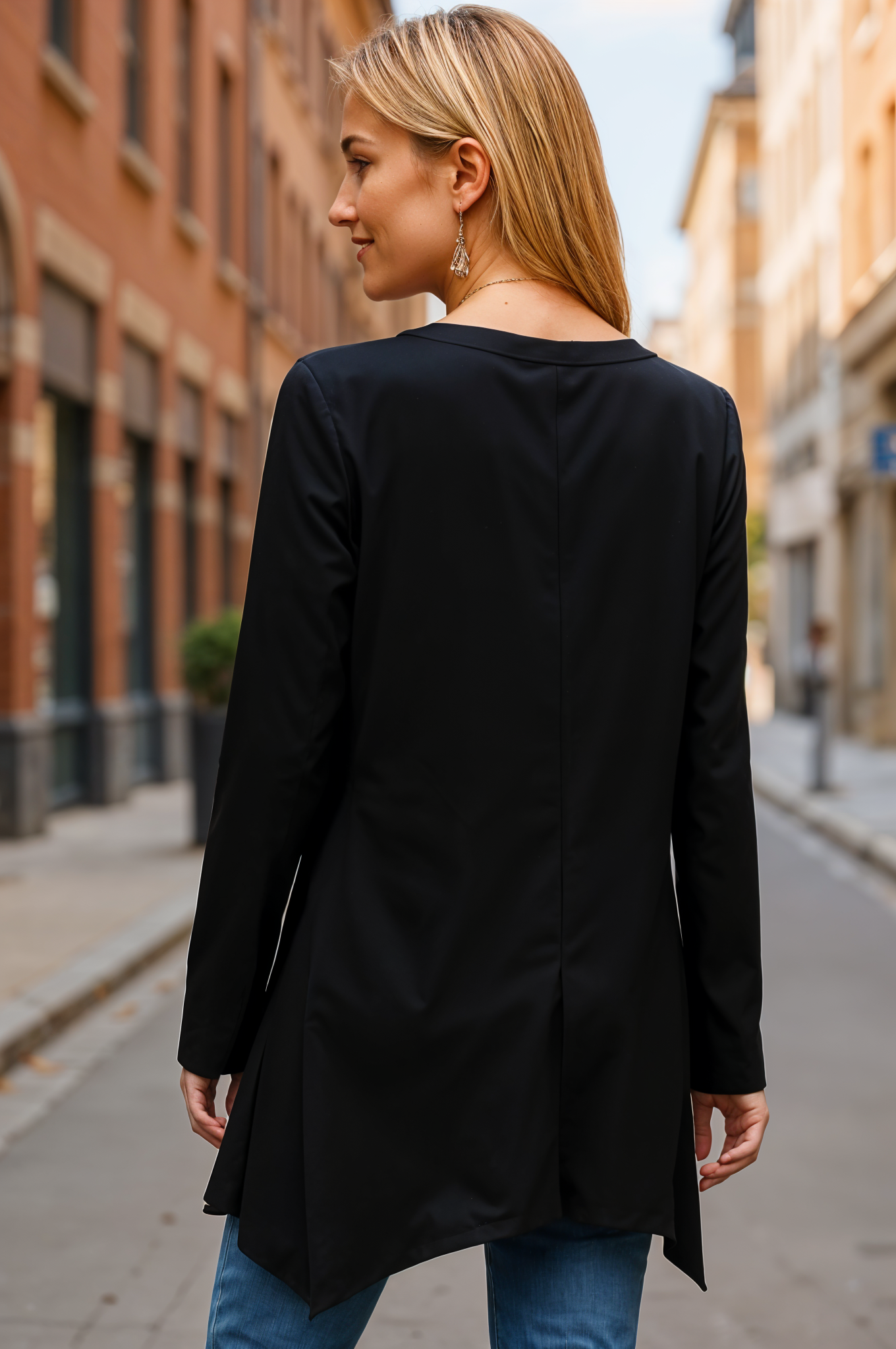 Elevate your casual wardrobe with this flowing, asymmetrical hem black tunic. Designed with a relaxed silhouette and long sleeves, it’s perfect for easy styling, whether you're dressing it up with accessories or keeping it simple with jeans. The high-low cut adds a touch of modern flair, offering comfort and style in one versatile piece. Ideal for everyday wear, this tunic is a timeless essential that transitions seamlessly from day to night.