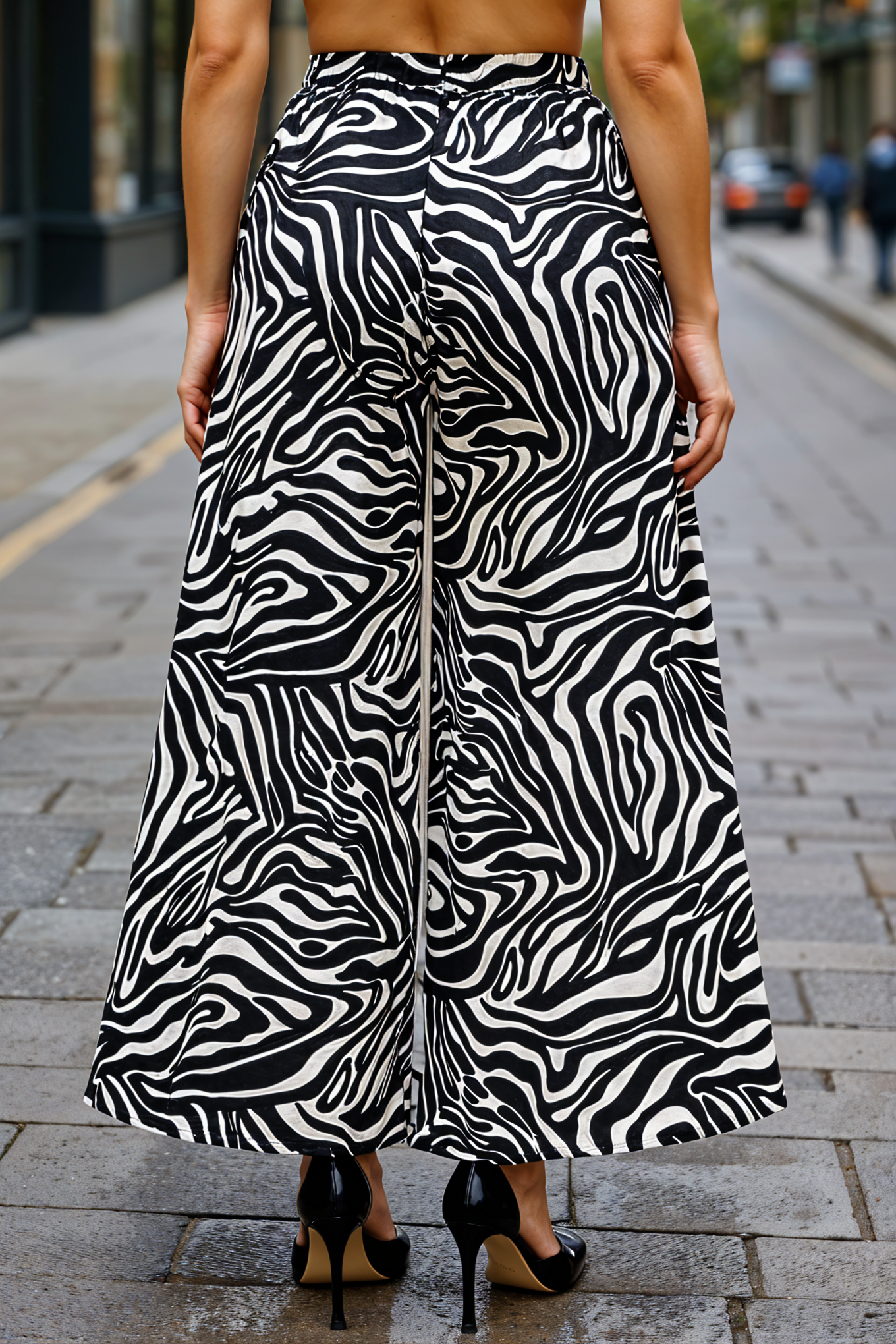Bold, breezy, and effortlessly stylish. These zebra-print wide-leg pants are designed for movement and comfort, featuring a flowy silhouette and an elastic waistband for the perfect fit. Whether you're lounging or making a statement, these pants add a touch of wild elegance to any look. Pair them with a sleek crop top for a striking ensemble.